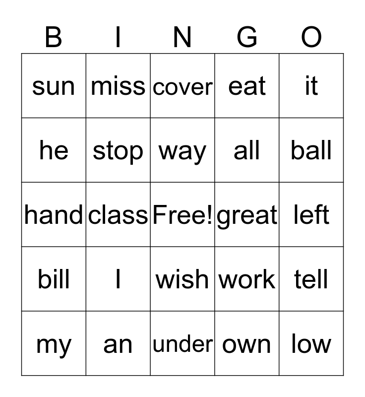 This bingo card has a free space and 24 words: I, an, way, my, it, sun, he, miss, great, wish, all, hand, work, tell, stop, own, left, cover, ball, class, low, bill, eat and under.