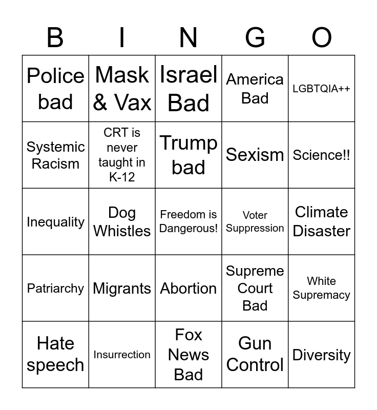 This bingo card has a free space and 26 words: Abortion, Gun Control, Trump bad, Insurrection, LGBTQIA++, Police bad, Systemic Racism, Mask & Vax, Climate Disaster, Supreme Court Bad, Sexism, Inequality, White Supremacy, Hate speech, Dog Whistles, Russia Collusion, America Bad, Patriarchy, Israel Bad, Diversity, Science!!, Fox News Bad, Voter Suppression, Migrants, CRT is never taught in K-12 and Debunked theory of election rigging.