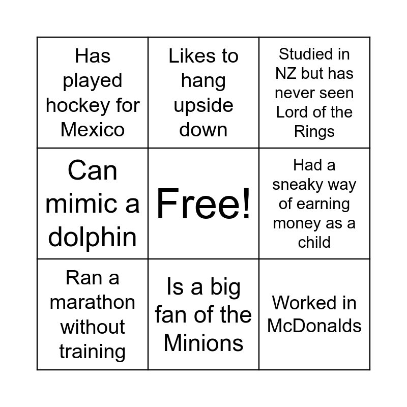 This bingo card has a free space and 15 words: Almost started a war, Would be happy only ever eating avocados, Studied in NZ but has never seen Lord of the Rings, Has played hockey for Mexico, Is a big fan of the Minions, Worked in McDonalds, Can make a balloon animal, Has an irrational fear, Had a sneaky way of earning money as a child, Got fired from their first job, Fell multiple times doing a motorcycle test, Can mimic a dolphin, Ran a marathon without training, Likes to hang upside down and Used to have purple hair.