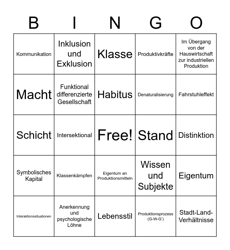 This bingo card has a free space and 24 words: Klassenkämpfen, Anerkennung und psychologische Löhne, Habitus, Interaktionssituationen, Im Übergang von der Hauswirtschaft zur industriellen Produktion, Kommunikation, Macht, Inklusion und Exklusion, Stand, Eigentum an Produktionsmitteln, Denaturalisierung, Schicht, Wissen und Subjekte, Eigentum, Funktional differenzierte Gesellschaft, Produktionsprozess (G-W-G‘), Distinktion, Klasse, Fahrstuhleffekt, Intersektional, Stadt-Land-Verhältnisse, Symbolisches Kapital, Produktivkräfte and Lebensstil.