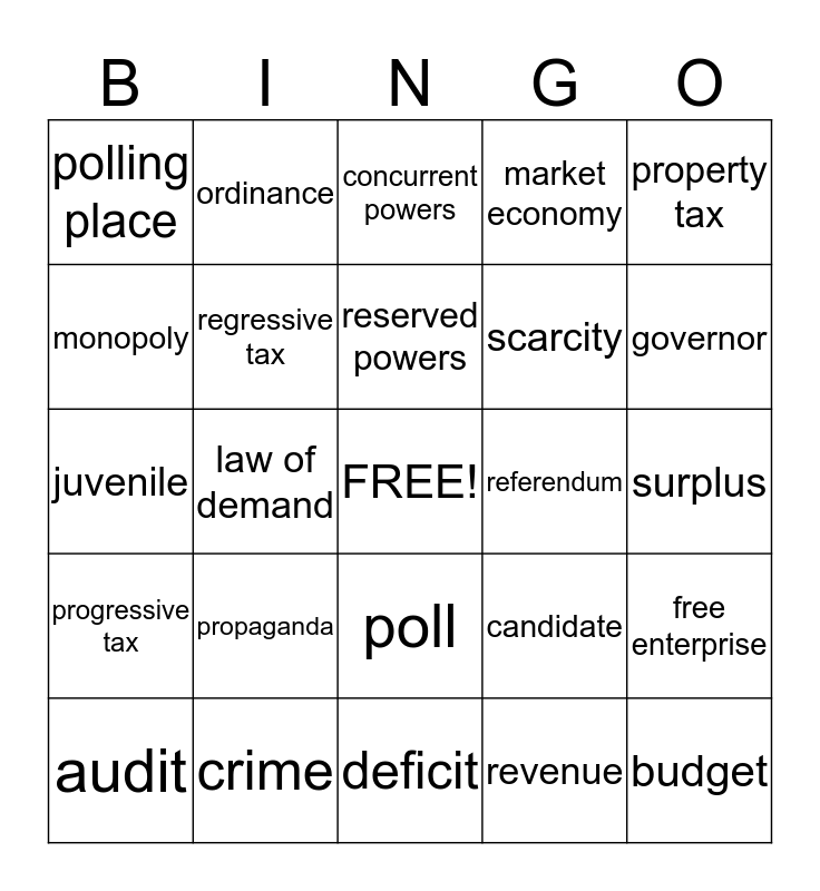 This bingo card has a free space and 34 words: national debt, revenue, tariff, income tax, progressive tax, regressive tax, property tax, audit, ordinance, delegated powers, reserved powers, concurrent powers, bicameral, unicameral, referendum, governor, crime, juvenile, propaganda, candidate, poll, precincts, polling place, surplus, deficit, budget, market economy, free market, scarcity, monopoly, law of supply, law of demand, free enterprise and capitalism.