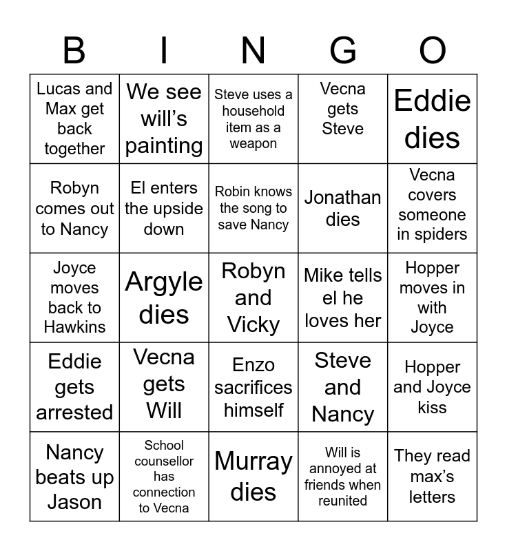 This bingo card has 25 words: Vecna gets Will, Murray dies, Robin knows the song to save Nancy, Nancy beats up Jason, Eddie dies, Lucas and Max get back together, Robyn comes out to Nancy, We see will’s painting, Mike tells el he loves her, Enzo sacrifices himself, Jonathan dies, Joyce moves back to Hawkins, Steve and Nancy, Hopper and Joyce kiss, El enters the upside down, They read max’s letters, Hopper moves in with Joyce, Steve uses a household item as a weapon, Vecna covers someone in spiders, Argyle dies, Robyn and Vicky, School counsellor has connection to Vecna, Eddie gets arrested, Vecna gets Steve and Will is annoyed at friends when reunited.