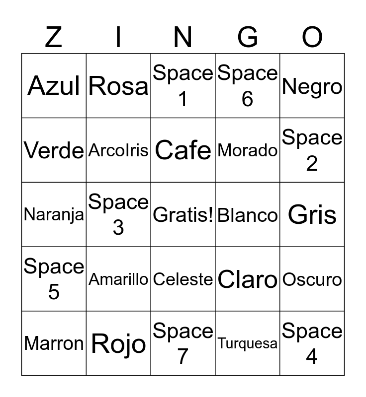 This bingo card has a free space and 24 words: Amarillo, Rojo, Cafe, Marron, Negro, Azul, Verde, Rosa, Blanco, Celeste, Morado, Naranja, Claro, Oscuro, ArcoIris, Turquesa, Gris, Space 1, Space 2, Space 3, Space 4, Space 5, Space 6 and Space 7.