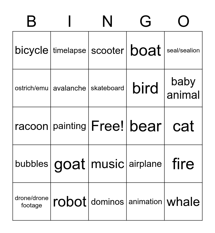 This bingo card has a free space and 70 words: dog, cat, pool, underwater, robot, plane, boat, alligator/croc, seal/sealion, science experiment, fire, explosion, bicycle, scooter, boardgame, painting, music, bird, car, bubbles, bear, airplane, baby animal, skiing, snowboarding, rodent, motorcycle, ape/monkey, animation, duck, timelapse, car crash, laser, space, turtle, tortoise, lizard, snake, giraffe, ostrich/emu, skydiving, goat, whale, dolphin, meerkat, avalanche, drone/drone footage, moose, spider, bubbles, shark, bug/insect, horse, weird animal noise, dominos, mushrooms, skateboard, redbull logo, octopus, farm animal, racoon, stop motion, extreme weather, car crash, fox, flock of birds, owl, big cat, art and water.