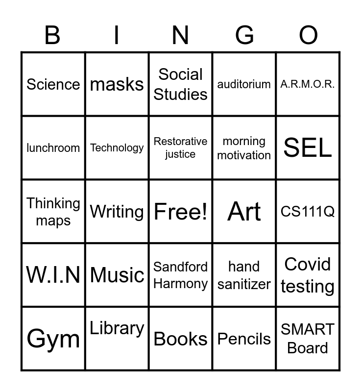 This bingo card has a free space and 29 words: Gym, Reading, Writing, Math, Science, Social Studies, Technology, Music, Art, Library, CS111Q, SMART Board, Books, Pencils, SEL, recess, Sandford Harmony, W.I.N, A.R.M.O.R., Thinking maps, hand sanitizer, computers, morning motivation, lunchroom, auditorium, masks, Covid testing, Restorative justice and Equity.