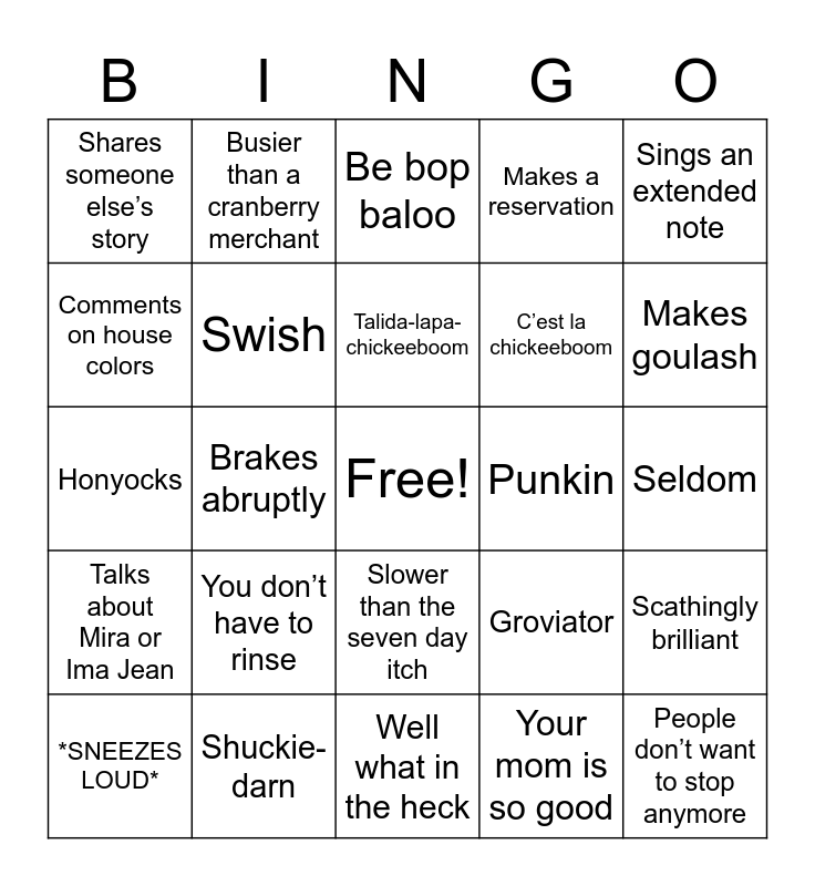 This bingo card has a free space and 24 words: You don’t have to rinse, Shuckie-darn, Talida-lapa-chickeeboom, *SNEEZES LOUD*, Sings an extended note, Shares someone else’s story, Comments on house colors, Busier than a cranberry merchant, Punkin, Slower than the seven day itch, C’est la chickeeboom, Honyocks, Groviator, Scathingly brilliant, Swish, Your mom is so good, Seldom, Be bop baloo, Makes goulash, Brakes abruptly, People don’t want to stop anymore, Talks about Mira or Ima Jean, Makes a reservation and Well what in the heck.