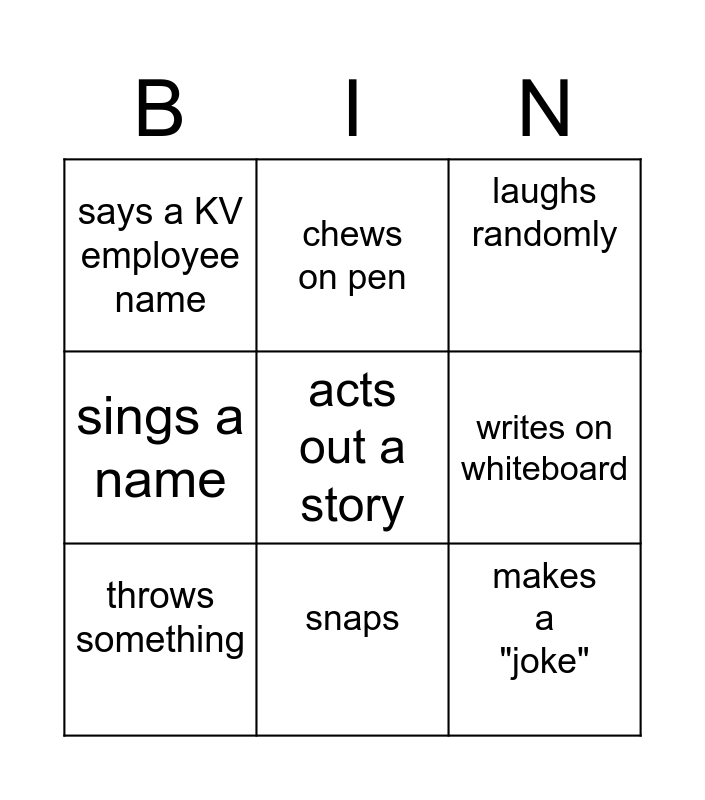 This bingo card has a free space and 11 words: says "no", snaps, makes a "joke", throws something, chews on pen, laughs randomly, writes on whiteboard, mentions dolly, sings a name, says a KV employee name and plays with hair.