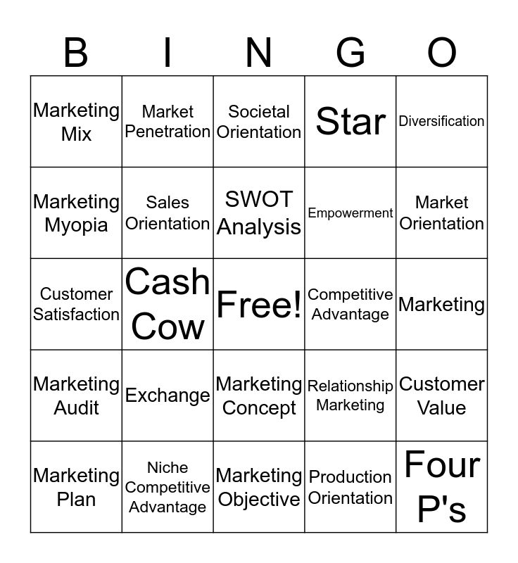 This bingo card has a free space and 24 words: Exchange, Niche Competitive Advantage, SWOT Analysis, Marketing Plan, Diversification, Marketing Mix, Marketing Myopia, Market Penetration, Competitive Advantage, Marketing Concept, Empowerment, Customer Satisfaction, Relationship Marketing, Customer Value, Sales Orientation, Production Orientation, Marketing, Societal Orientation, Market Orientation, Cash Cow, Four P's, Marketing Audit, Star and Marketing Objective.