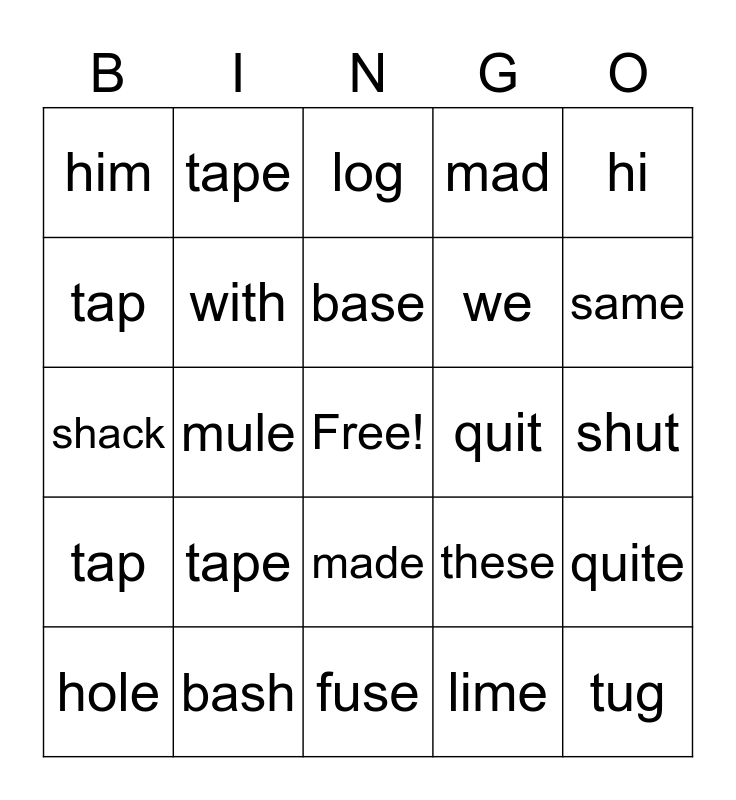 This bingo card has a free space and 29 words: quake, bash, log, she, hi, him, with, base, quit, quite, hole, mule, lime, tug, shack, when, fuse, these, same, tap, tape, go, we, shut, tap, tape, made, mad and athlete.