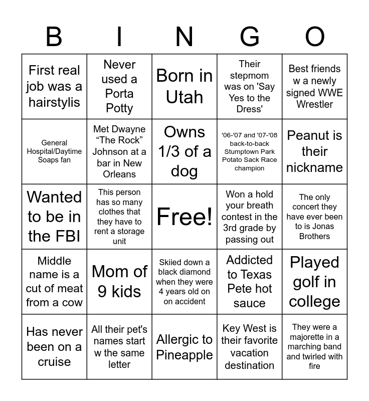 This bingo card has a free space and 24 words: Mom of 9 kids, All their pet's names start w the same letter, Owns 1/3 of a dog, Has never been on a cruise, Best friends w a newly signed WWE Wrestler, First real job was a hairstylis, General Hospital/Daytime Soaps fan, Never used a Porta Potty, Won a hold your breath contest in the 3rd grade by passing out, Skiied down a black diamond when they were 4 years old on on accident, '06-'07 and '07-'08 back-to-back Stumptown Park Potato Sack Race champion, Wanted to be in the FBI, Addicted to Texas Pete hot sauce, Played golf in college, Met Dwayne “The Rock” Johnson at a bar in New Orleans, Key West is their favorite vacation destination, The only concert they have ever been to is Jonas Brothers, Born in Utah, Peanut is their nickname, This person has so many clothes that they have to rent a storage unit, They were a majorette in a marching band and twirled with fire, Middle name is a cut of meat from a cow, Their stepmom was on 'Say Yes to the Dress' and Allergic to Pineapple.