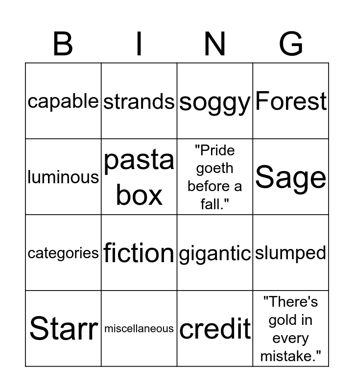 This bingo card has 16 words: miscellaneous, slumped, soggy, capable, categories, strands, gigantic, credit, luminous, pasta box, Starr, Forest, fiction, Sage, "Pride goeth before a fall." and "There's gold in every mistake.".