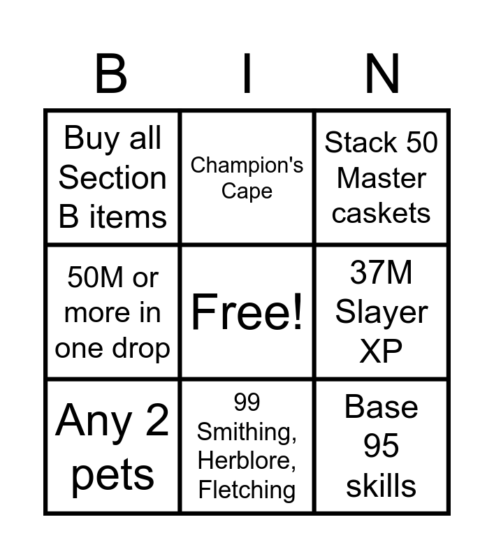 This bingo card has a free space and 8 words: 37M Slayer XP, Stack 50 Master caskets, Champion's Cape, Any 2 pets, Buy all Section B items, Base 95 skills, 50M or more in one drop and 99 Smithing, Herblore, Fletching.