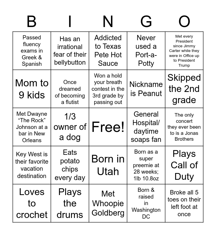 This bingo card has a free space and 24 words: Eats potato chips every day, Plays the drums, Won a hold your breath contest in the 3rd grade by passing out, Loves to crochet, Met every President since Jimmy Carter while they were in Office up to President Trump, Passed fluency exams in Greek & Spanish, Mom to 9 kids, Has an irrational fear of their bellybutton, General Hospital/ daytime soaps fan, Born in Utah, Nickname is Peanut, Met Dwayne “The Rock” Johnson at a bar in New Orleans, Born as a super preemie at 28 weeks; 1lb 10.8oz, Plays Call of Duty, Once dreamed of becoming a flutist, Born & raised in Washington DC, The only concert they ever been to is a Jonas Brothers, Addicted to Texas Pete Hot Sauce, Skipped the 2nd grade, 1/3 owner of a dog, Broke all 5 toes on their left foot at once, Key West is their favorite vacation destination, Never used a Port-a-Potty and Met Whoopie Goldberg.