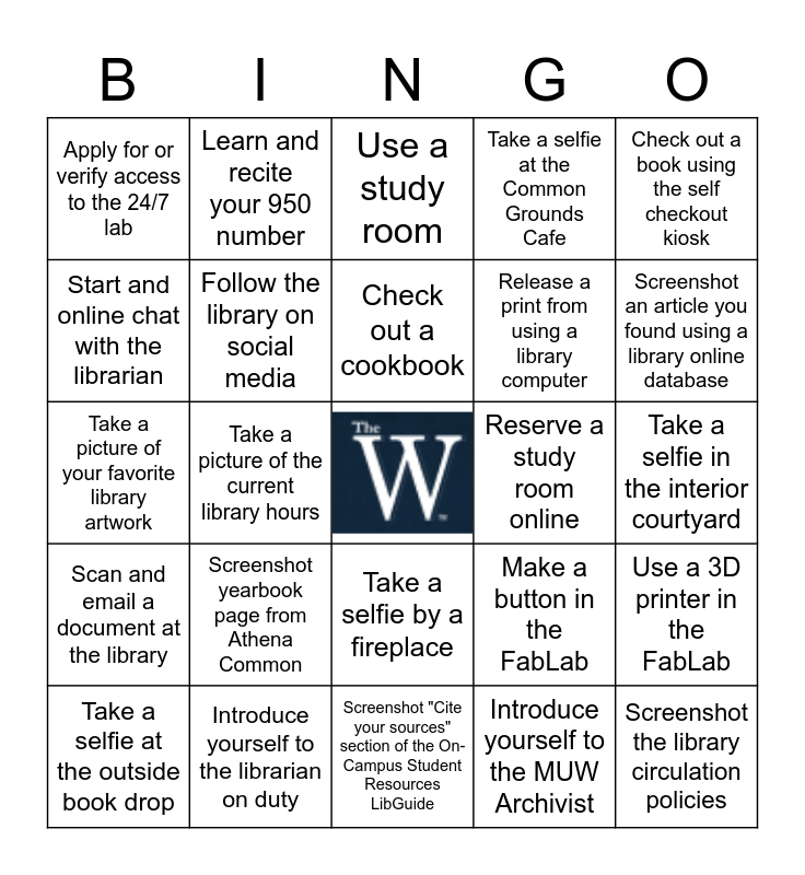 This bingo card has a free space and 24 words: Screenshot yearbook page from Athena Common, Introduce yourself to the librarian on duty, Check out a cookbook, Take a selfie at the outside book drop, Check out a book using the self checkout kiosk, Apply for or verify access to the 24/7 lab, Start and online chat with the librarian, Learn and recite your 950 number, Reserve a study room online, Take a selfie by a fireplace, Release a print from using a library computer, Take a picture of your favorite library artwork, Make a button in the FabLab, Use a 3D printer in the FabLab, Follow the library on social media, Introduce yourself to the MUW Archivist, Take a selfie in the interior courtyard, Use a study room, Screenshot an article you found using a library online database, Take a picture of the current library hours, Screenshot the library circulation policies, Scan and email a document at the library, Take a selfie at the Common Grounds Cafe and Screenshot "Cite your sources" section of the On-Campus Student Resources LibGuide.