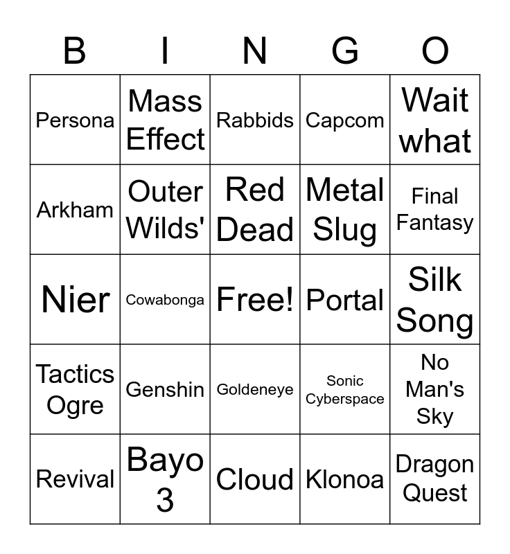 This bingo card has a free space and 24 words: Genshin, Bayo 3, Red Dead, Revival, Wait what, Persona, Arkham, Mass Effect, Portal, Goldeneye, Metal Slug, Nier, Sonic Cyberspace, No Man's Sky, Outer Wilds', Klonoa, Silk Song, Rabbids, Final Fantasy, Cowabonga, Dragon Quest, Tactics Ogre, Capcom and Cloud.