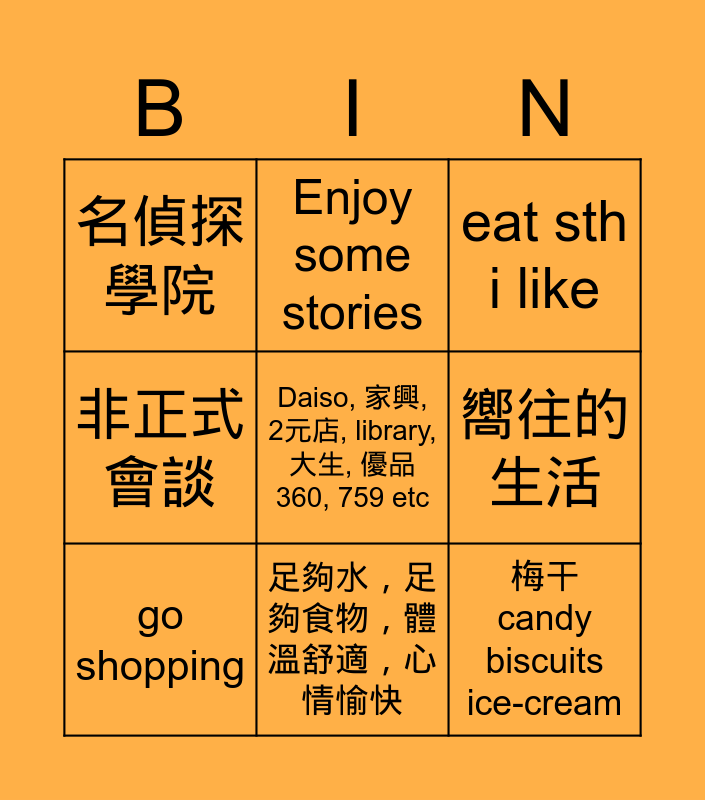 This bingo card has 9 words: go shopping, eat sth i like, Enjoy some stories, 非正式會談, 名偵探學院, 嚮往的生活, Daiso, 家興, 2元店, library, 大生, 優品360, 759 etc, 梅干 candy biscuits ice-cream and 足夠水,足夠食物,體溫舒適,心情愉快.