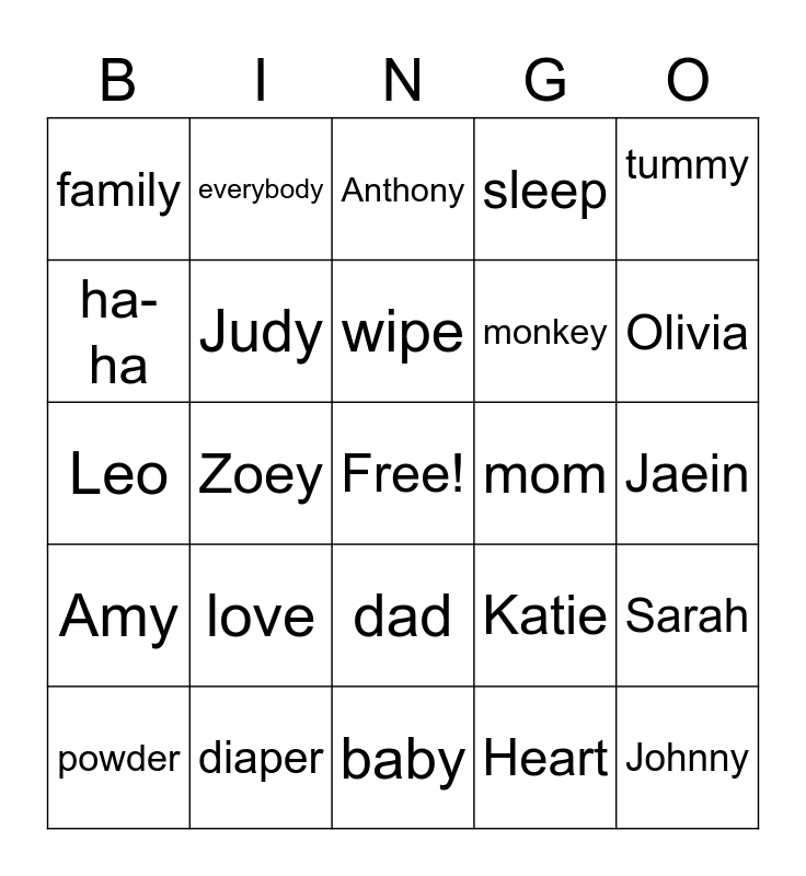 This bingo card has a free space and 24 words: love, diaper, wipe, powder, tummy, family, ha-ha, everybody, mom, dad, monkey, Leo, Katie, Sarah, Judy, Heart, Jaein, Anthony, Olivia, Zoey, Johnny, Amy, sleep and baby.