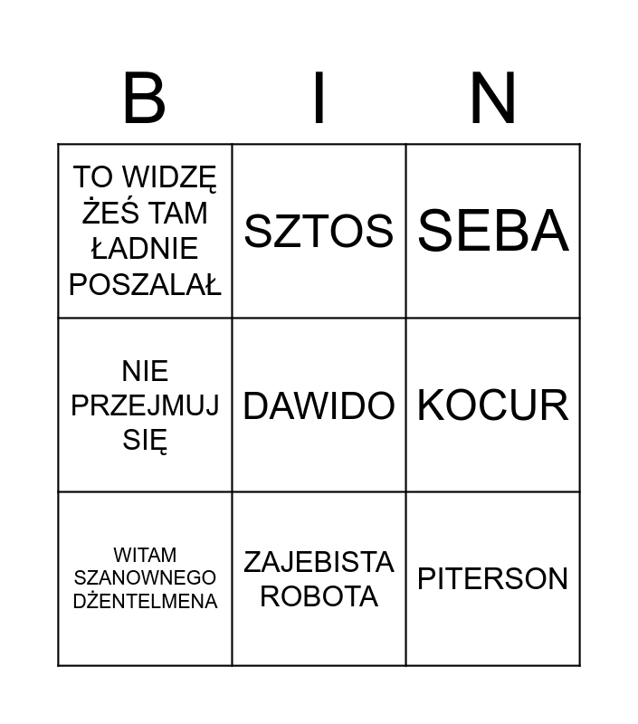 This bingo card has a free space and 8 words: KOCUR, SEBA, SZTOS, WITAM SZANOWNEGO DŻENTELMENA, TO WIDZĘ ŻEŚ TAM ŁADNIE POSZALAŁ, PITERSON, NIE PRZEJMUJ SIĘ and ZAJEBISTA ROBOTA.