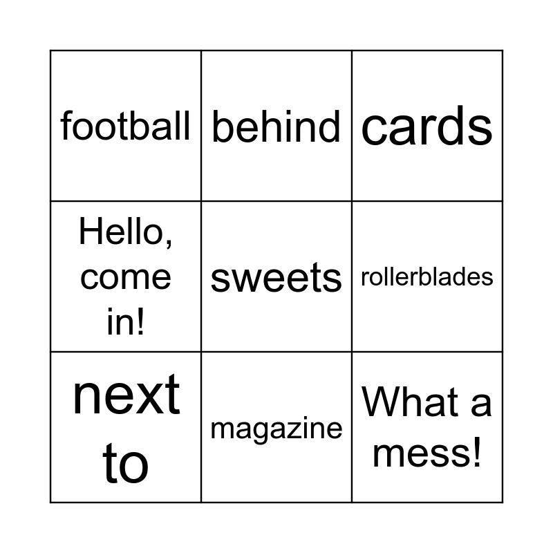 This bingo card has 15 words: watch, umbrella, cards, football, magazine, sweets, glasses, cat, rollerblades, What a mess!, Scat, cat!, Hello, come in!, next to, behind and in front of.