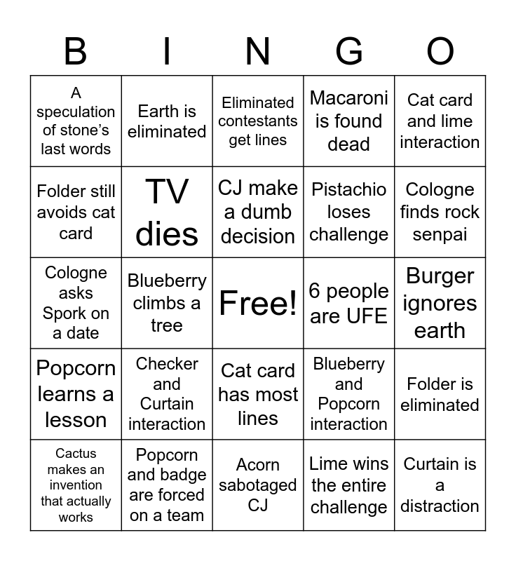 This bingo card has a free space and 24 words: Checker and Curtain interaction, Popcorn and badge are forced on a team, CJ make a dumb decision, Cactus makes an invention that actually works, Cat card and lime interaction, A speculation of stone’s last words, Folder still avoids cat card, Earth is eliminated, 6 people are UFE, Cat card has most lines, Pistachio loses challenge, Cologne asks Spork on a date, Blueberry and Popcorn interaction, Folder is eliminated, TV dies, Lime wins the entire challenge, Burger ignores earth, Eliminated contestants get lines, Cologne finds rock senpai, Blueberry climbs a tree, Curtain is a distraction, Popcorn learns a lesson, Macaroni is found dead and Acorn sabotaged CJ.