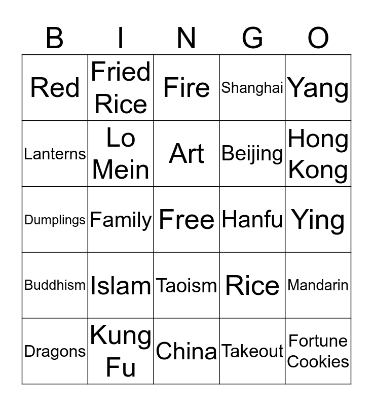 This bingo card has a free space and 24 words: Islam, Kung Fu, Art, Dragons, Yang, Red, Lanterns, Fried Rice, Hanfu, Taoism, Beijing, Dumplings, Rice, Mandarin, Lo Mein, Takeout, Ying, Fire, Hong Kong, Family, Fortune Cookies, Buddhism, Shanghai and China.