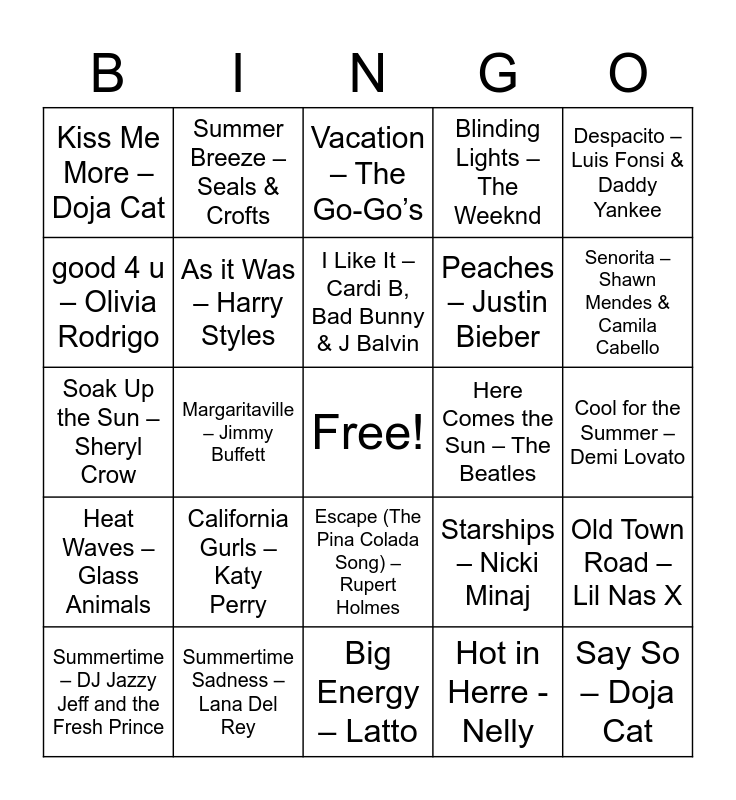 This bingo card has a free space and 32 words: Hot in Herre - Nelly, Kokomo – The Beach Boys, Margaritaville – Jimmy Buffett, Hot Stuff – Donna Summer, Heat Waves – Glass Animals, As it Was – Harry Styles, Despacito – Luis Fonsi & Daddy Yankee, Old Town Road – Lil Nas X, Summer Breeze – Seals & Crofts, Todo De Ti – Rauw Alejandro, I Like It – Cardi B, Bad Bunny & J Balvin, Vacation – The Go-Go’s, Good Times – Chic, Summer of ’69 – Bryan Adams, Here Comes the Sun – The Beatles, Walking On Sunshine – Katrina and the Waves, Summertime – DJ Jazzy Jeff and the Fresh Prince, Soak Up the Sun – Sheryl Crow, Escape (The Pina Colada Song) – Rupert Holmes, California Gurls – Katy Perry, Starships – Nicki Minaj, Hot Girl Summer – Megan Thee Stallion, Cool for the Summer – Demi Lovato, Summertime Sadness – Lana Del Rey, Say So – Doja Cat, Blinding Lights – The Weeknd, Peaches – Justin Bieber, good 4 u – Olivia Rodrigo, Kiss Me More – Doja Cat, Big Energy – Latto, Bam Bam – Camila Cabello and Senorita – Shawn Mendes & Camila Cabello.