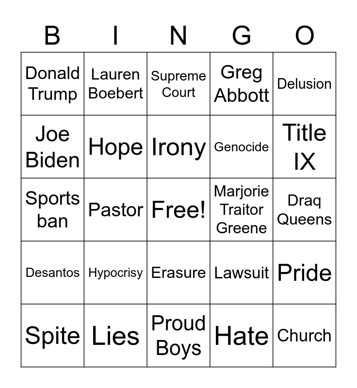 This bingo card has a free space and 24 words: Hypocrisy, Lies, Irony, Spite, Delusion, Donald Trump, Joe Biden, Lauren Boebert, Marjorie Traitor Greene, Erasure, Genocide, Sports ban, Lawsuit, Pride, Hope, Hate, Draq Queens, Supreme Court, Title IX, Pastor, Church, Desantos, Greg Abbott and Proud Boys.