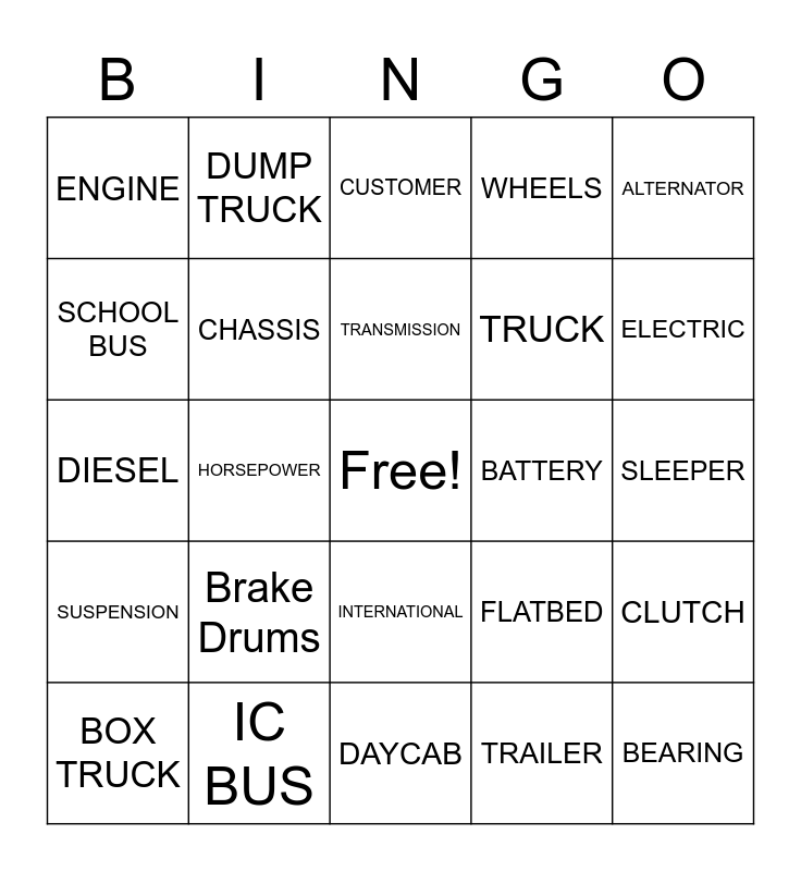This bingo card has a free space and 24 words: Brake Drums, IC BUS, TRANSMISSION, BOX TRUCK, ALTERNATOR, ENGINE, SCHOOL BUS, DUMP TRUCK, BATTERY, INTERNATIONAL, TRUCK, DIESEL, FLATBED, CLUTCH, CHASSIS, TRAILER, SLEEPER, CUSTOMER, ELECTRIC, HORSEPOWER, BEARING, SUSPENSION, WHEELS and DAYCAB.