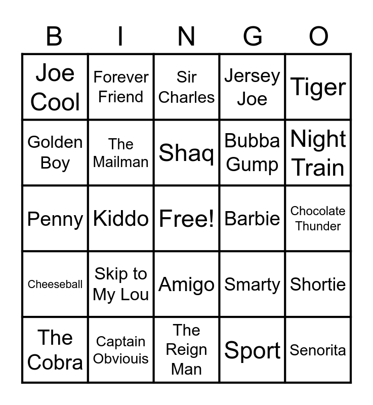 This bingo card has a free space and 80 words: King James, Marvelous, Sir Charles, The Admiral, The Great One, Real Deal, The Grim Reaper, The Black Mamba, The Matrix, The Kid, Stan the Man, The Hitman, Jersey Joe, Joe Cool, Swaggy P, Golden Boy, Mr. October, Skip to My Lou, White Chocolate, Chocolate Thunder, Sweet Pea, Tiger, Penny, Shaq, The Mailman, The Glove, The Refrigerator, Bad Moon, The Truth, Broadway Joe, Night Train, Pistol Pete, The Reign Man, The Dominator, The Cobra, Barbie, Rapunzel, ms. Congeniality, Queen, Senorita, Girly, Gal, Bestie, Bambi, Friend For Life, Forever Friend, Blondie, Nugget, Teacup, Oldie, Shortie, Kiddo, Smarty, Boomer, Scout, Ace, Buddy, Champ, Bro, Amigo, Bubba Gump, Tank, Tiny, Goon, Punk, Bond, Giggles, Speedy, Squirt, Smiley, Cheeseball, Captain Obviouis, Sugar Cube, Teeny, Clumsy Wumsy, Comedy Central, Sport, The Professor, Sir Dunkalot and Last Man Standing.