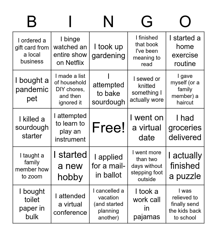 This bingo card has a free space and 24 words: I started a new hobby, I attended a virtual conference, I attempted to bake sourdough, I bought toilet paper in bulk, I started a home exercise routine, I ordered a gift card from a local business, I bought a pandemic pet, I binge watched an entire show on Netflix, I went on a virtual date, I applied for a mail-in ballot, I sewed or knitted something I actually wore, I killed a sourdough starter, I went more than two days without stepping foot outside, I actually finished a puzzle, I made a list of household DIY chores, and then ignored it, I took a work call in pajamas, I had groceries delivered, I took up gardening, I gave myself (or a family member) a haircut, I attempted to learn to play an instrument, I was relieved to finally send the kids back to school, I taught a family member how to zoom, I finished that book I've been meaning to read and I cancelled a vacation (and started planning another).