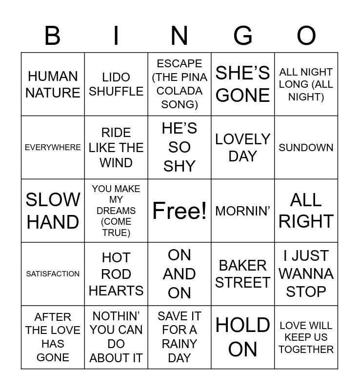 This bingo card has a free space and 75 words: ISLANDS IN THE STREAM, LOWDOWN, ESCAPE (THE PINA COLADA SONG), REMINISCING, MINUTE BY MINUTE, SUMMER BREEZE, GUILTY, BRANDY (YOU’RE A FINE GIRL), BIGGEST PART OF ME, DON’T GO BREAKING MY HEART, WHAT’S LOVE GOT TO DO WITH IT, ROSANNA, HE’S SO SHY, EVERYWHERE, WHAT YOU WON’T DO FOR LOVE, YOU MAKE MY DREAMS (COME TRUE), WHENEVER I CALL YOU “FRIEND”, LOVE WILL KEEP US TOGETHER, TAKE IT EASY, ALL NIGHT LONG (ALL NIGHT), AFRICA, SLOW HAND, RIDE LIKE THE WIND, LIDO SHUFFLE, SHE’S GONE, I’D REALLY LOVE TO SEE YOU TONIGHT, MAGIC, WAITING FOR A GIRL LIKE YOU, DANCE WITH ME, SAILING, WHAT A FOOL BELIEVES, EASY LOVER, LOVIN’ TOUCHIN’ SQUEEZIN’, BAKER STREET, SUNDOWN, LOVELY DAY, FOOLISH HEART, TIME PASSAGES, ALL RIGHT, HOLD ON, THE GIRL IS MINE, HOW LONG, THUNDER ISLAND, THIS IS IT, STUMBLIN’ IN, YOU CAN’T CHANGE THAT, AFTER THE LOVE HAS GONE, HUMAN NATURE, ALIBIS, SARA SMILE, YOU CAN DO MAGIC, ON AND ON, STEAL AWAY, THROUGH THE FIRE, REELIN’ IN THE YEARS, TAKING IT TO THE STREETS, WE’RE IN THIS LOVE TOGETHER, NEVER GONNA LET YOU GO, HOLD THE LINE, HEART TO HEART, HOT ROD HEARTS, BABY COME TO ME, I KEEP FORGETTIN (EVERY TIME YOU’RE NEAR), FM, GET USED TO IT, MORNIN’, LOVE WILL FIND A WAY, TURN YOUR LOVE AROUND, BOYS OF AUTUMN, I JUST WANNA STOP, SATISFACTION, NOTHIN’ YOU CAN DO ABOUT IT, HEY NINETEEN, SAVE IT FOR A RAINY DAY and SO INTO YOU.