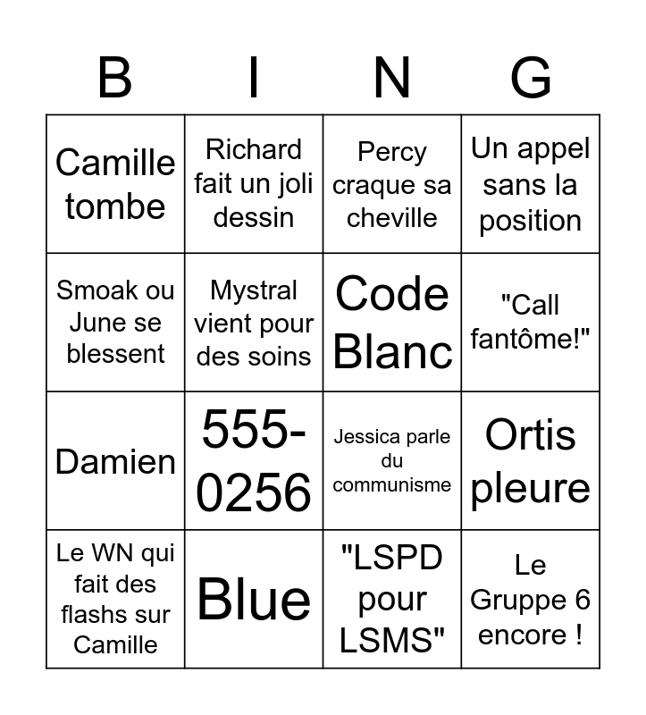 This bingo card has 16 words: Blue, Ortis pleure, Percy craque sa cheville, Camille tombe, Damien, Richard fait un joli dessin, Jessica parle du communisme, "LSPD pour LSMS", Smoak ou June se blessent, Mystral vient pour des soins, Le WN qui fait des flashs sur Camille, Un appel sans la position, 555-0256, "Call fantôme!", Code Blanc and Le Gruppe 6 encore !.