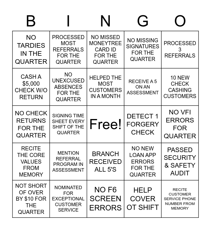 This bingo card has a free space and 24 words: MENTION REFERRAL PROGRAM IN ASSESSMENT, NOMINATED FOR EXCEPTIONAL CUSTOMER SERVICE, HELPED THE MOST CUSTOMERS IN A MONTH, NOT SHORT OF OVER BY $10 FOR THE QUARTER, PROCESSED 3 REFERRALS, NO TARDIES IN THE QUARTER, CASH A $5,000 CHECK W/O RETURN, PROCESSED MOST REFERRALS FOR THE QUARTER, DETECT 1 FORGERY CHECK, BRANCH RECEIVED ALL 5'S, RECEIVE A 5 ON AN ASSESSMENT, NO CHECK RETURNS FOR THE QUARTER, NO NEW LOAN APP ERRORS FOR THE QUARTER, PASSED SECURITY & SAFETY AUDIT, NO UNEXCUSED ABSENCES FOR THE QUARTER, HELP COVER OT SHIFT, NO VFI ERRORS FOR QUARTER, NO MISSED MONEYTREE CARD ID FOR THE QUARTER, 10 NEW CHECK CASHING CUSTOMERS, SIGNING TIME SHEET EVERY SHIFT OF THE QUARTER, RECITE CUSTOMER SERVICE PHONE NUMBER FROM MEMORY, RECITE THE CORE VALUES FROM MEMORY, NO MISSING SIGNATURES FOR THE QUARTER and NO F6 SCREEN ERRORS.