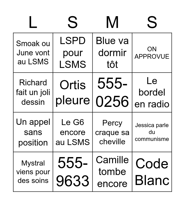 This bingo card has 19 words: Percy craque sa cheville, Le WN qui fait des flash sur le LSMS, Blue va dormir tôt, Code Blanc, Jessica parle du communisme, Richard fait un joli dessin, Camille tombe encore, Smoak ou June vont au LSMS, LSPD pour LSMS, Un appel sans position, Le G6 encore au LSMS, Ortis pleure, 555-0256, 555-9633, Mystral viens pour des soins, Fusillade, ON APPROVUE, Le bordel en radio and "C'EST MON HÔPITAL".