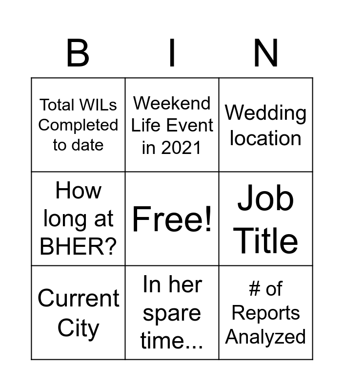 This bingo card has a free space and 9 words: Current City, Wedding location, Weekend Life Event in 2021, How long at BHER?, Total WILs Completed to date, Job Title, # of Reports Analyzed, Universities Attended and In her spare time....