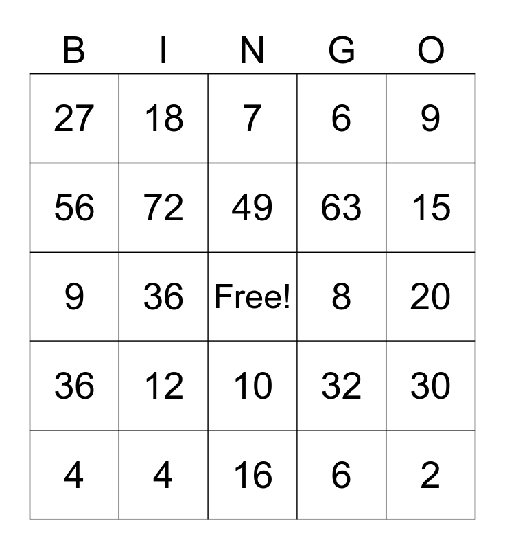 This bingo card has a free space and 45 words: 1, 2, 3, 4, 5, 6, 7, 8, 9, 4, 6, 8, 10, 12, 14, 16, 18, 9, 12, 15, 18, 21, 24, 27, 16, 20, 24, 28, 32, 36, 25, 30, 35, 40, 45, 36, 42, 48, 54, 49, 56, 63, 64, 72 and 81.