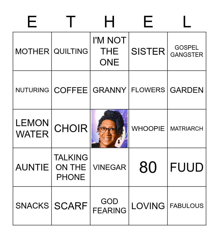 This bingo card has a free space and 24 words: TALKING ON THE PHONE, SCARF, GRANNY, SNACKS, GOSPEL GANGSTER, MOTHER, NUTURING, QUILTING, WHOOPIE, VINEGAR, FLOWERS, LEMON WATER, 80, FUUD, COFFEE, LOVING, MATRIARCH, I'M NOT THE ONE, GARDEN, CHOIR, FABULOUS, AUNTIE, SISTER and GOD FEARING.