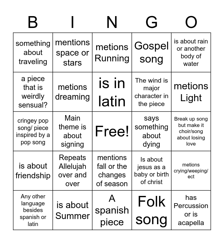 This bingo card has a free space and 25 words: Repeats Allelujah over and over, A spanish piece, is in latin, Any other language besides spanish or latin, is about rain or another body of water, something about traveling, a piece that is weirdly sensual?, mentions space or stars, says something about dying, mentions fall or the changes of season, The wind is major character in the piece, cringey pop song/ piece inspired by a pop song, Is about jesus as a baby or birth of christ, metions crying/weeping/ ect, metions dreaming, Piece about freedom and living your best life, Break up song but make it choir/song about losing love, metions Running, metions Light, Main theme is about signing, has Percussion or is acapella, is about Summer, is about friendship, Gospel song and Folk song.