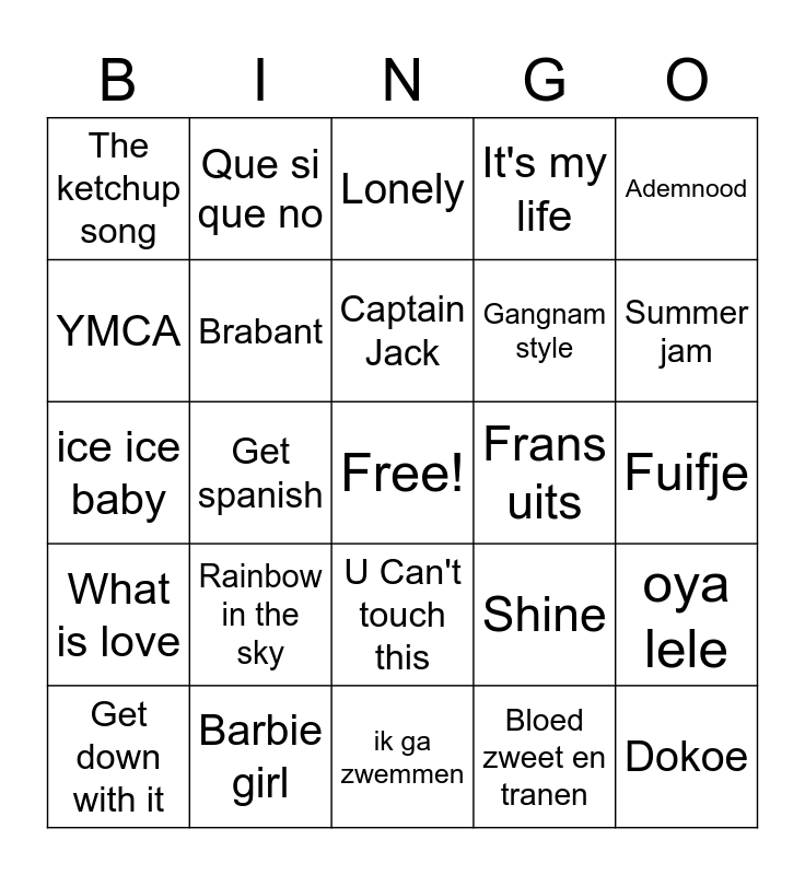 This bingo card has a free space and 26 words: U Can't touch this, Bloed zweet en tranen, Captain Jack, Barbie girl, Ademnood, The ketchup song, YMCA, Que si que no, Fuifje, Shine, Gangnam style, ice ice baby, oya lele, Get down with it, Get spanish, Baby, It's my life, What is love, Lonely, Dokoe, Summer jam, ik ga zwemmen, Frans uits, Rainbow in the sky, Brabant and Rampeneren.