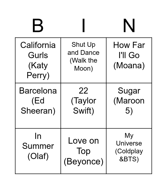 This bingo card has 9 words: In Summer (Olaf), How Far I'll Go (Moana), Shut Up and Dance (Walk the Moon), Barcelona (Ed Sheeran), California Gurls (Katy Perry), Sugar (Maroon 5), 22 (Taylor Swift), My Universe (Coldplay &BTS) and Love on Top (Beyonce).