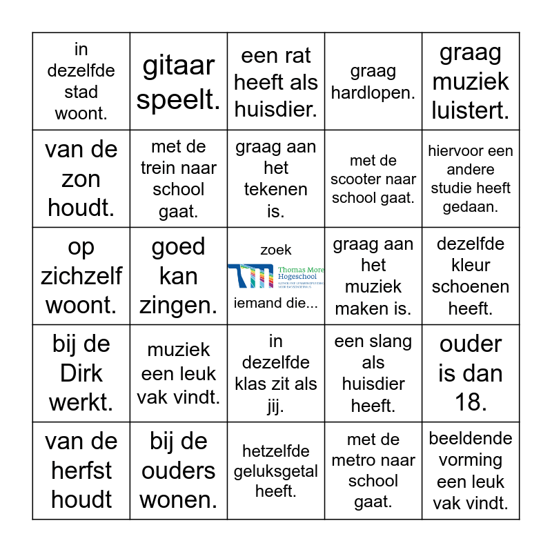 This bingo card has a free space and 89 words: dezelfde sport leuk vindt., dezelfde huisdier heeft., in dezelfde klas zit als jij., hetzelfde eten lekker vindt., begint met dezelfde voorletter., een hond heeft als huisdier., dezelfde kleur sokken heeft., dezelfde hobby's heeft., graag naar buiten gaat., in de horeca werkt., veel sport., dezelfde leeftijd heeft., ouder is dan 18., dezelfde kleur schoenen heeft., rekenen leuk vindt., graag aan het tekenen is., graag aan het lezen is., naar dezelfde muziek luistert., in dezelfde maand is geboren., leerkracht wil worden., graag een gesprek aangaat., dezelfde eigenschappen heeft., hetzelfde geluksgetal heeft., graag in de tuin bezig is., op zichzelf woont., bij de ouders wonen., linkshandig zijn., rechtshandig zijn., op dansen zitten., een paard hebben., graag hardlopen., goed kan zingen., een Samsung hebben., in dezelfde stad woont., tweeling is., een rat heeft als huisdier., van de zon houdt., werkt als oppasser., hiervoor een andere studie heeft gedaan., van de herfst houdt, bij de Dirk werkt., een rood shirt aan heeft., in een andere klas zit., een goudvis heeft., een slang als huisdier heeft., graag aan het muziek maken is., in de winter jarig is., in de zomer jarig is., een hamster heeft als huisdier., gitaar speelt., van de zomer houdt., een cavia heeft als huisdier., van de winter houdt., van de lente houdt., hockey speelt., uitkijkt naar dit jaar., met de bus naar school gaat., dezelfde kledingstijl heeft., al bekend is binnen de Thomas More., graag aan het koken is., trompet kan spelen., een N in haar naam heeft., een D in haar naam heeft., piano kan spelen., een Iphone hebben., taal een leuk vak vindt., spelling een leuk vak vindt., aardrijkskunde een leuk vak vindt., geschiedenis een leuk vak vindt., muziek een leuk vak vindt., beeldende vorming een leuk vak vindt., natuur een leuk vak vindt., in de lente jarig is., met de scooter naar school gaat., met de trein naar school gaat., met de metro naar school gaat., al eens voor de klas heeft gestaan., in de herfst jarig is., met de fiets naar school gaat., graag tv kijkt., graag muziek luistert., een ketting draagt., bij de plus werkt., bij de Jumbo werkt., broertje(s) heeft., zusje(s) heeft., een I in haar naam heeft, een kat als huisdier heeft. and met de tram naar school gaat..
