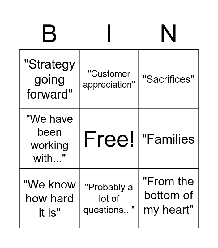 This bingo card has a free space and 8 words: "Families, "Sacrifices", "Customer appreciation", "We know how hard it is", "Strategy going forward", "From the bottom of my heart", "We have been working with..." and "Probably a lot of questions...".