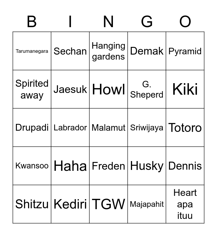 This bingo card has a free space and 24 words: Haha, Kediri, Howl, Shitzu, Pyramid, Tarumanegara, Spirited away, Sechan, Sriwijaya, Freden, G. Sheperd, Drupadi, Husky, Dennis, Jaesuk, Majapahit, Totoro, Hanging gardens, Kiki, Labrador, Heart apa ituu, Kwansoo, Demak and TGW.