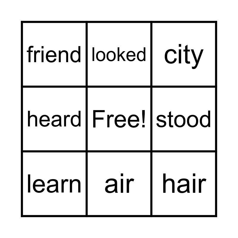 This bingo card has a free space and 10 words: air, city, friend, hair, heard, learn, looked, remember, stood and street.