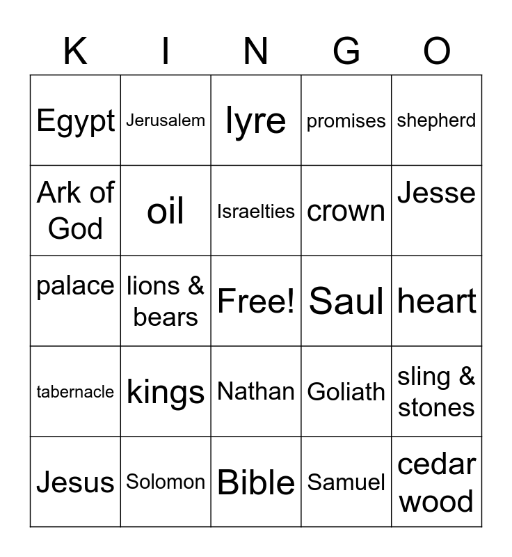 This bingo card has a free space and 24 words: kings, Solomon, Israelties, Jesus, shepherd, Egypt, Ark of God, Jerusalem, Saul, Nathan, crown, palace, Goliath, sling & stones, oil, Samuel, heart, lyre, Jesse, lions & bears, cedar wood, tabernacle, promises and Bible.