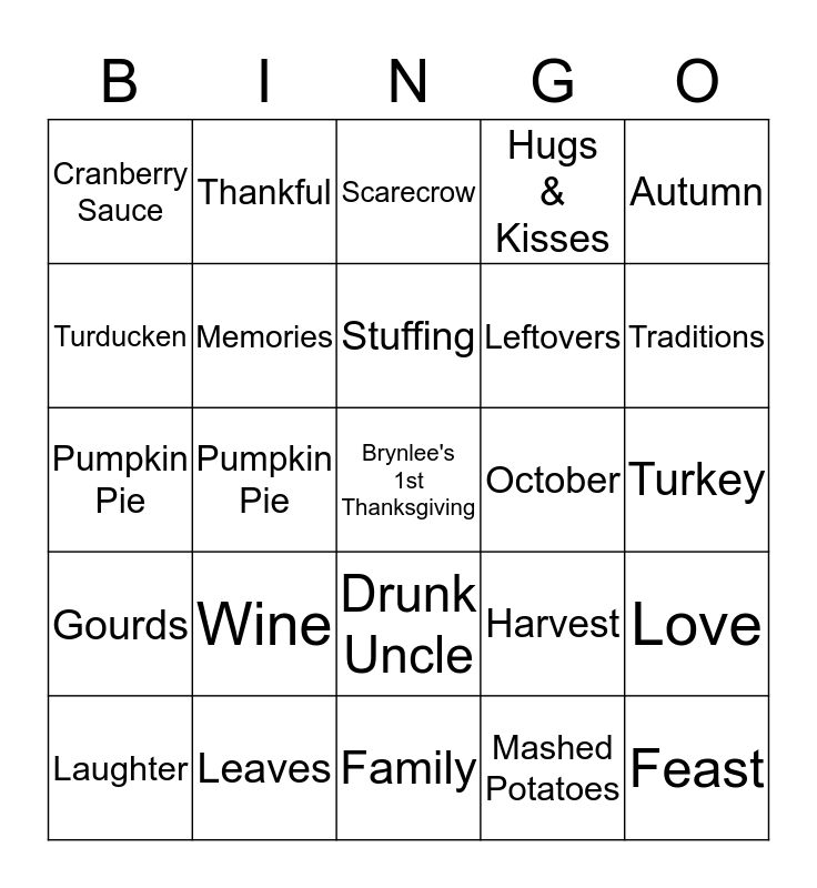 This bingo card has a free space and 24 words: Wine, Leaves, Stuffing, Laughter, Autumn, Cranberry Sauce, Turducken, Thankful, October, Drunk Uncle, Leftovers, Pumpkin Pie, Harvest, Love, Memories, Mashed Potatoes, Turkey, Scarecrow, Traditions, Pumpkin Pie, Feast, Gourds, Hugs & Kisses and Family.