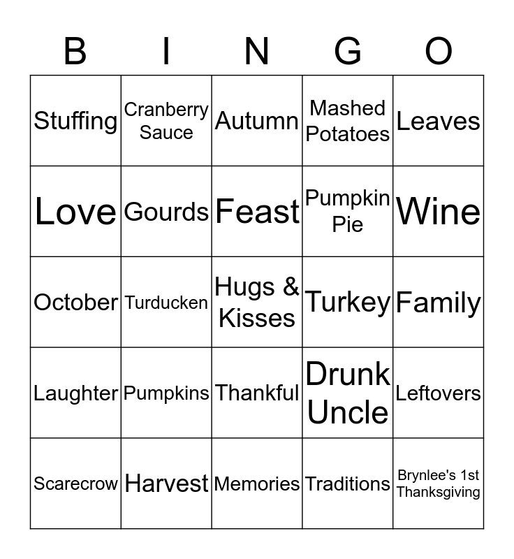 This bingo card has 25 words: Pumpkins, Memories, Feast, Scarecrow, Leaves, Stuffing, Love, Cranberry Sauce, Turkey, Thankful, Pumpkin Pie, October, Drunk Uncle, Leftovers, Gourds, Brynlee's 1st Thanksgiving, Family, Autumn, Wine, Turducken, Hugs & Kisses, Harvest, Laughter, Mashed Potatoes and Traditions.