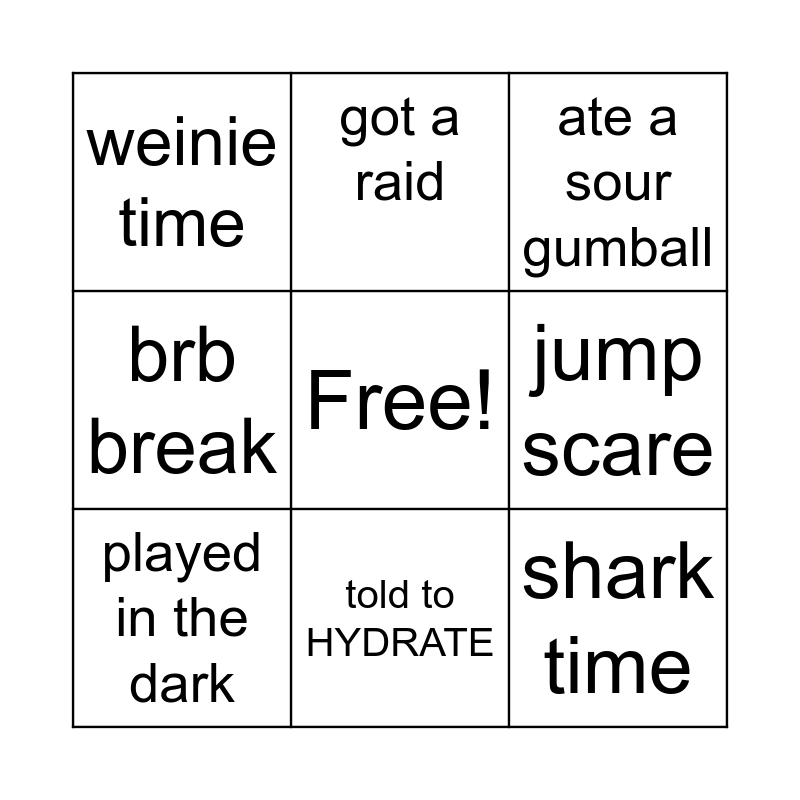 This bingo card has a free space and 8 words: jump scare, ate a sour gumball, got a raid, played in the dark, weinie time, shark time, brb break and told to HYDRATE.