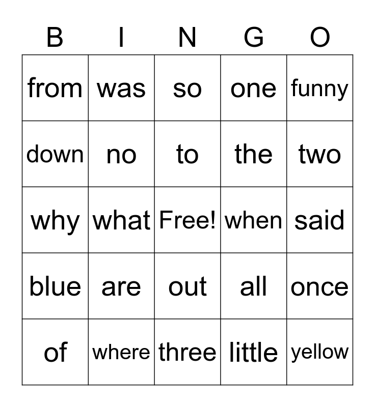 This bingo card has a free space and 24 words: are, where, to, of, funny, from, down, was, when, out, the, why, all, once, no, little, said, so, two, what, yellow, blue, one and three.