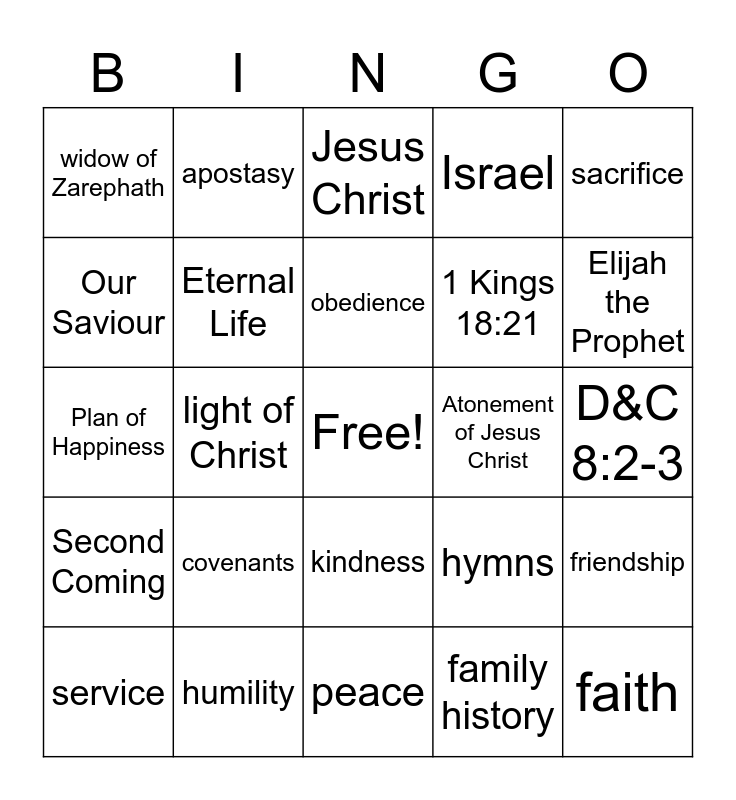 This bingo card has a free space and 74 words: Nephi, Lehi, Jesus Christ, commandments, Book of Mormon, Holy Bible, Toronto Temple, missionary, service, love, families are forever, happiness, obedience, Our Saviour, truth, light of Christ, Kingdom of God, Elijah the Prophet, Plan of Salvation, Plan of Happiness, Eternal Life, apostasy, Israel, preach the gospel, faith, baptism, Holy Ghost, miracles, Old Testament, still small voice, sacrifice, blessings, family, worship, chapel, family history, prophet, President Russell M. Nelson, reverent, prayer, peace, humility, charity, pure love of Christ, Come Follow Me, widow of Zarephath, child of God, covenants, Sacrament, scriptures, 3 Nephi 11:3-7, open-hearted, D&C 8:2-3, revelation, Moses, heart, kindness, mercy, forgiveness, friendship, 1 Kings 18:21, New Testament, Second Coming, The Lord, Atonement of Jesus Christ, resurrection, listen, ponder, hymns, disciple, apostles, inspiration, remember and The Holy Spirit.